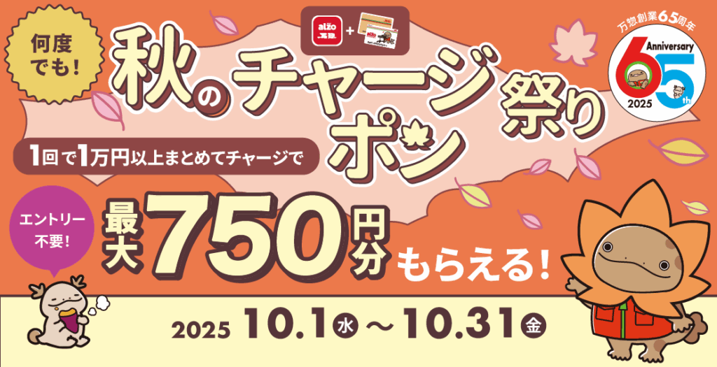 また、キャンペーンやイベントに参加するともらえる、アルゾ・万惣カードのチャージが増えるチャージクーポンもあります!