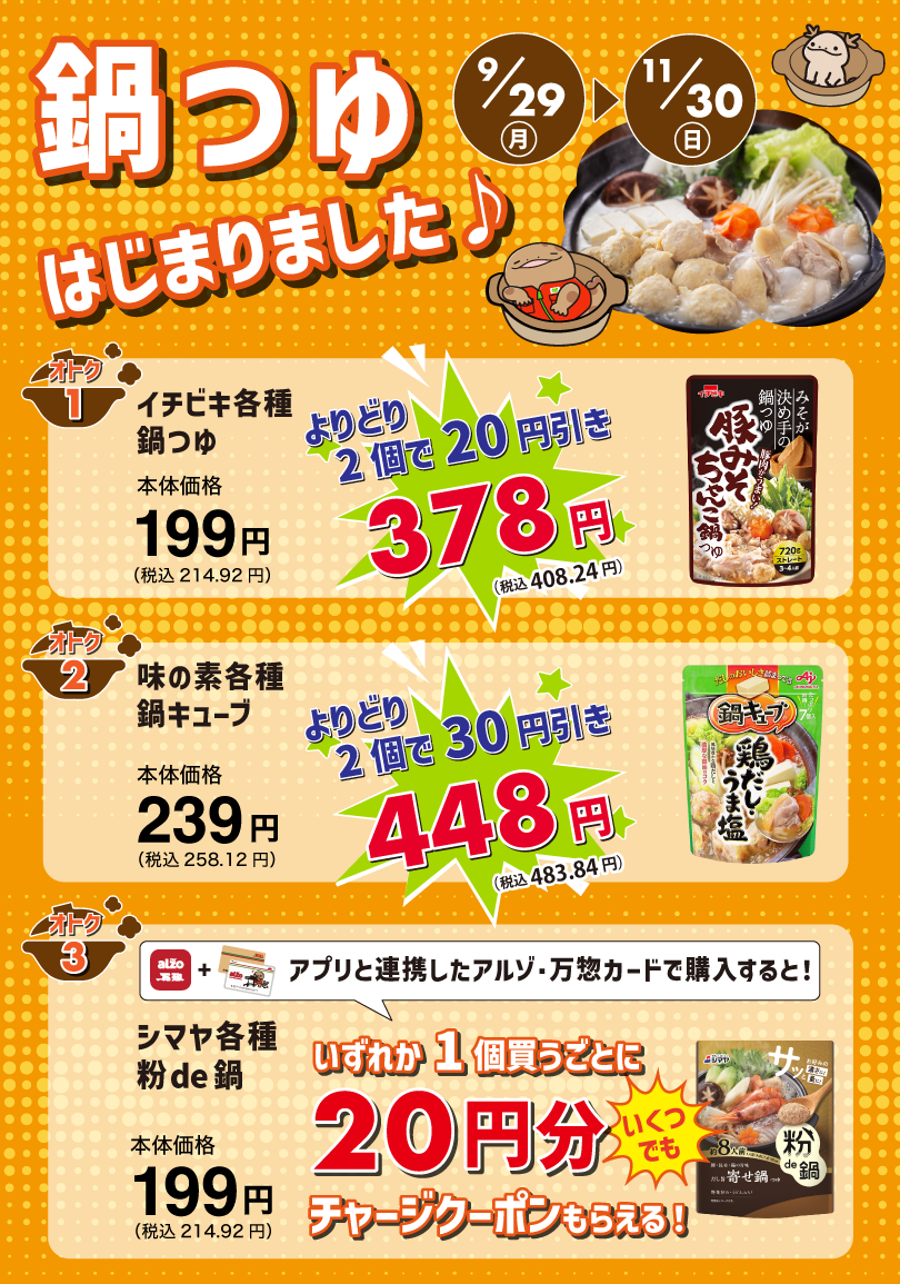 鍋のシーズン到来!鍋つゆをオトクに買いましょう!(9/29〜11/30)