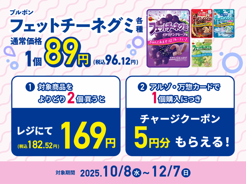 フェットチーネグミをまとめて購入でお得!さらにアプリと連携したアルゾ・万惣カードで買うと1個購入ごとにチャージクーポンがもらえる!
