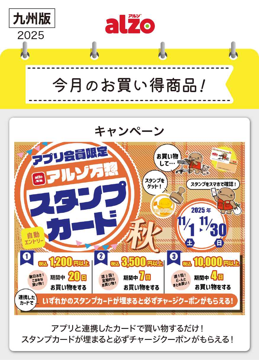 アプリ会員限定!アルゾ万惣スタンプラリー秋 開催!期間中に条件を達成された方全員にチャージクーポンをプレゼントいたします!スタンプカードは3つの中からいずれか達成でOK!お客様のお買い物に合わせて達成を目指しましょう!