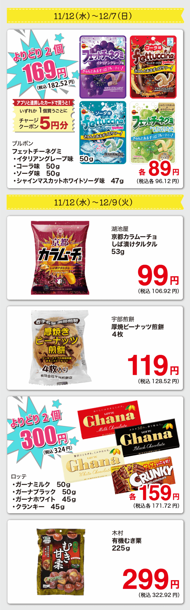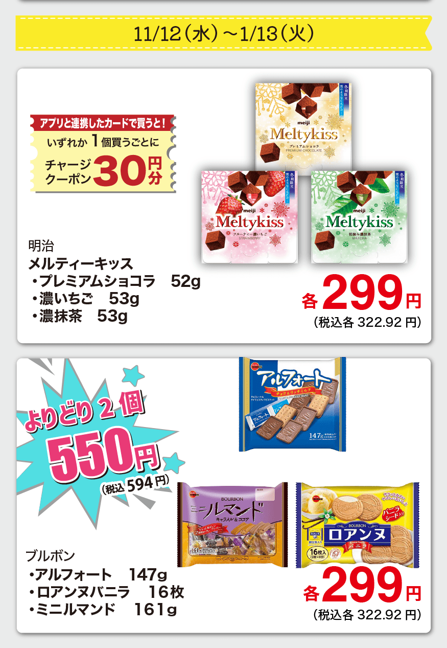アプリと連携したカードで買うと、いずれか1個買うごとにチャージクーポン30円もらえます♪