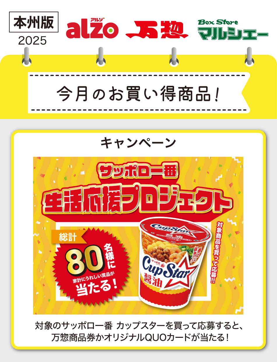 対象のサッポロ一番 カップスターを買って応募すると、万惣商品券かオリジナルQUOカードが当たる!