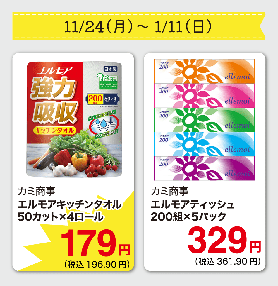 エルモアキッチンタオルはディープエンボス加工(両面処理)で水や油をパワフル吸収。年末にむけ、お料理に大掃除に大活躍!税抜179円(税込196.90円)で販売中!
