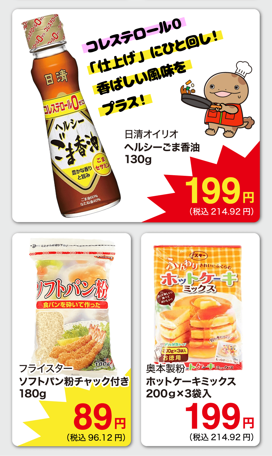 程よい出汁味で、ゆず果汁のすっぱさを抑えたまろやかなポン酢。鍋の季節だから常備しておきたい!税抜169円(税込各182.52円)コレステロール0ヘルシーごま香油130gが税抜199円(税込214.92円)!香ばしい風味をプラス!