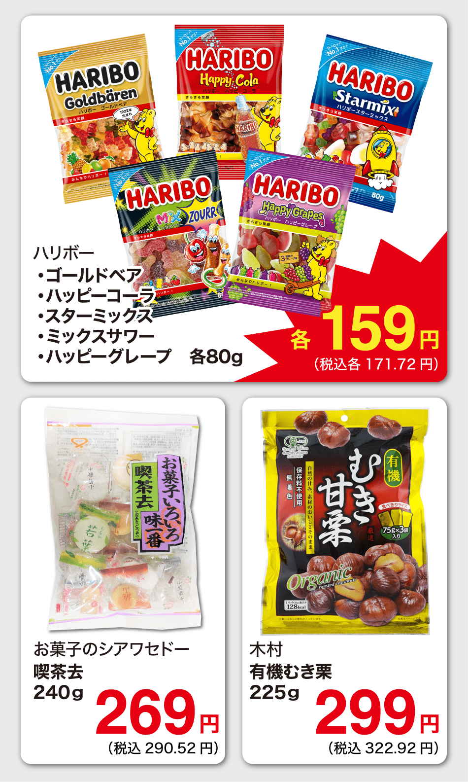 ハリボー5種類大集合!税抜各159円(税込各171.72円)!大人でも子供でもきっとお気に入りが見つかる!クリスマスのおやつに、ハリボーを!