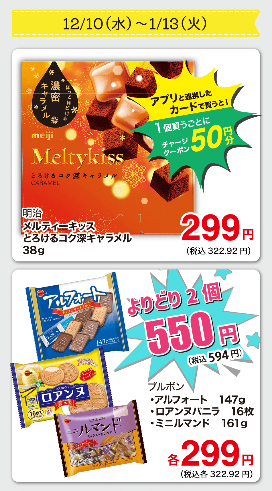 メルティーキッスに「とろけるコク深キャラメル」が登場!アプリと連携したアルゾ・万惣カードで買うだけ!1個購入ごとに最大50円分のチャージクーポンがもらえます!税抜299円(税込322.92円)