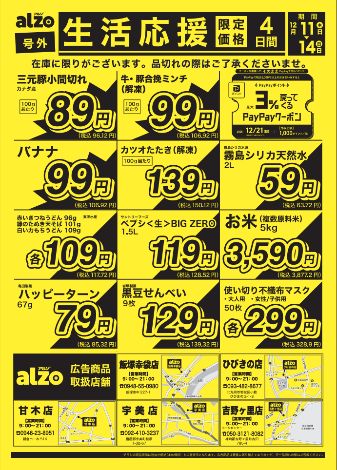 【チラシ】九州alzo(12/11〜12/14) 2025年12月10日 最終更新日時 : 2025年12月9日 dxmanso対象店舗飯塚幸袋店・ひびきの店・甘木店・宇美店・吉野ケ里店チラシのお知らせです。ご来店お待ちしております!