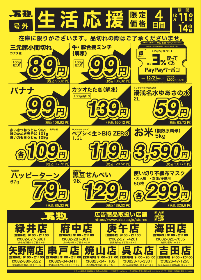 【チラシ】万惣(12/11〜12/14) 2025年12月10日 最終更新日時 : 2025年12月9日 dxmanso対象店舗緑井店・府中店・庚午店・海田店・矢野南店・串戸店・焼山店・呉広店・吉田店チラシのお知らせです。ご来店お待ちしております!