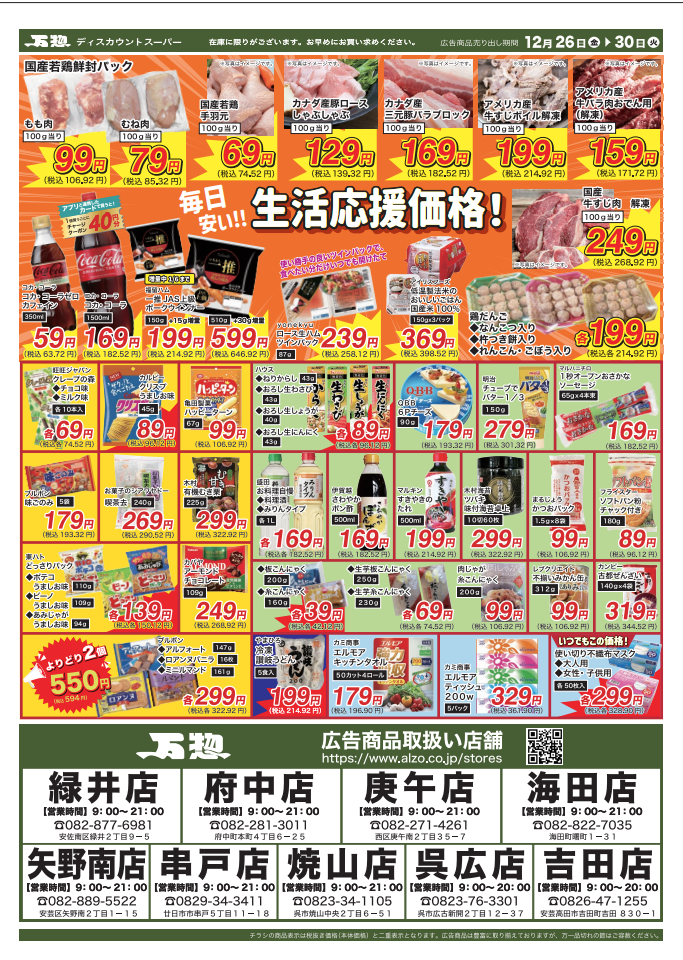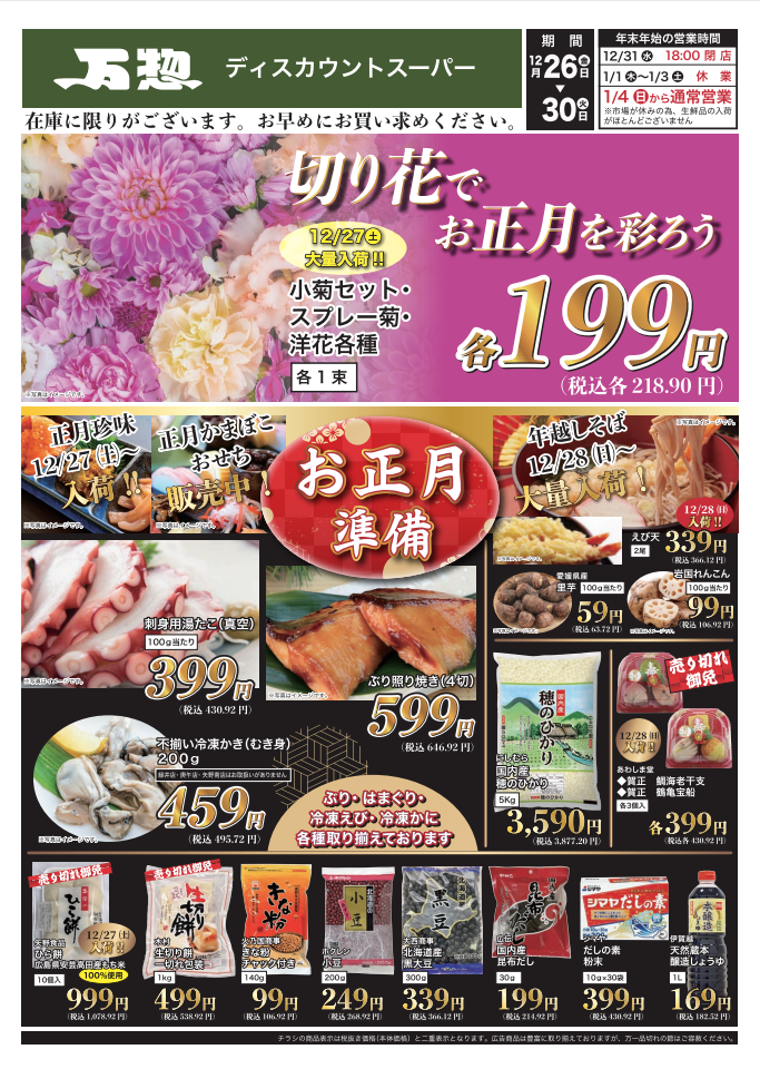 【チラシ】万惣(12/26〜12/30) 2025年12月25日 最終更新日時 : 2025年12月23日 dxmanso対象店舗緑井店・府中店・庚午店・海田店・矢野南店・串戸店・焼山店・呉広店・吉田店チラシのお知らせです。ご来店お待ちしております!