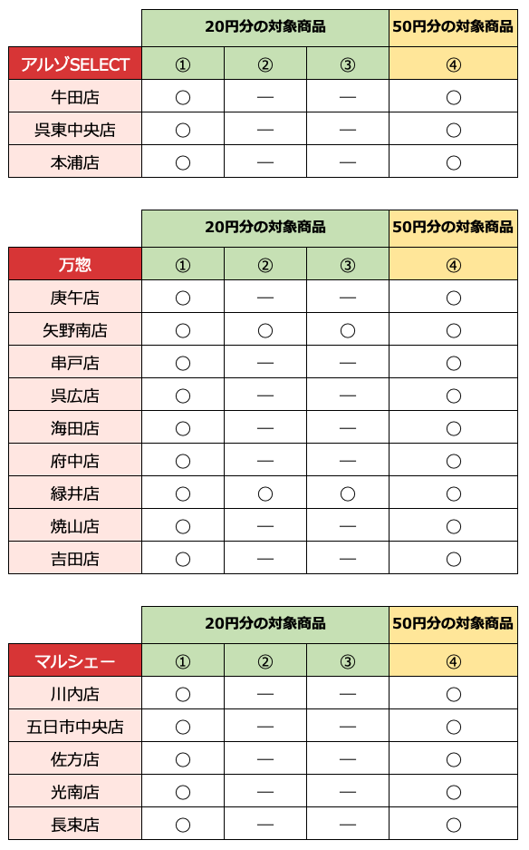 20円分がもらえる対象商品を1個購入、50円分がもらえる対象商品を1個購入:70円分