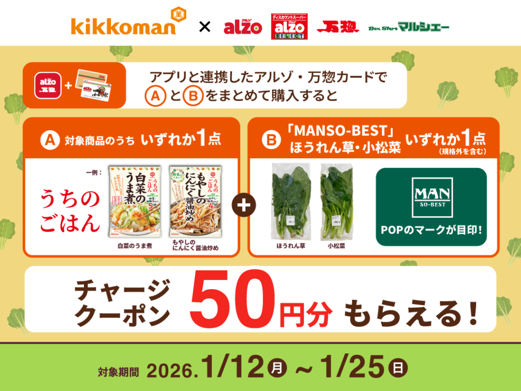 アプリと連携したアルゾ・万惣カードで、うちのごはん1点と、MANSO−BESTの野菜1点をまとめて購入すると、必ずチャージクーポン50円分がもらえます!