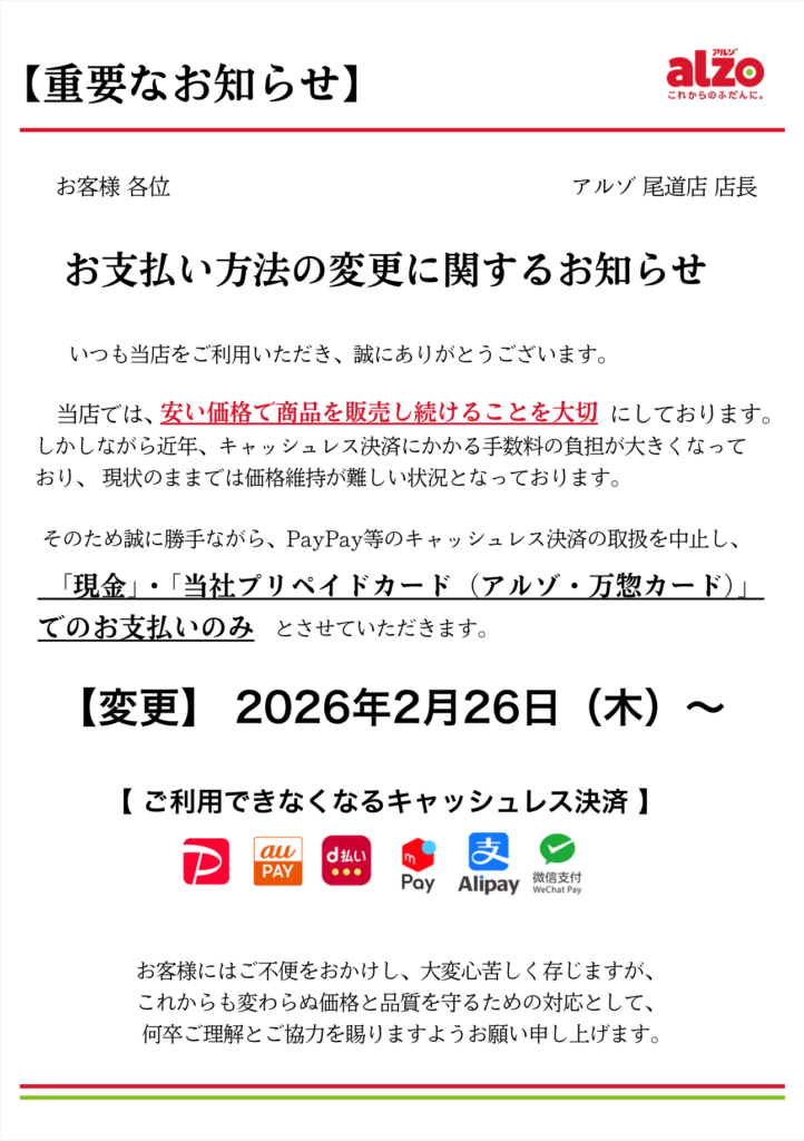 お支払い方法の変更に関するお知らせ(アルゾ尾道店)