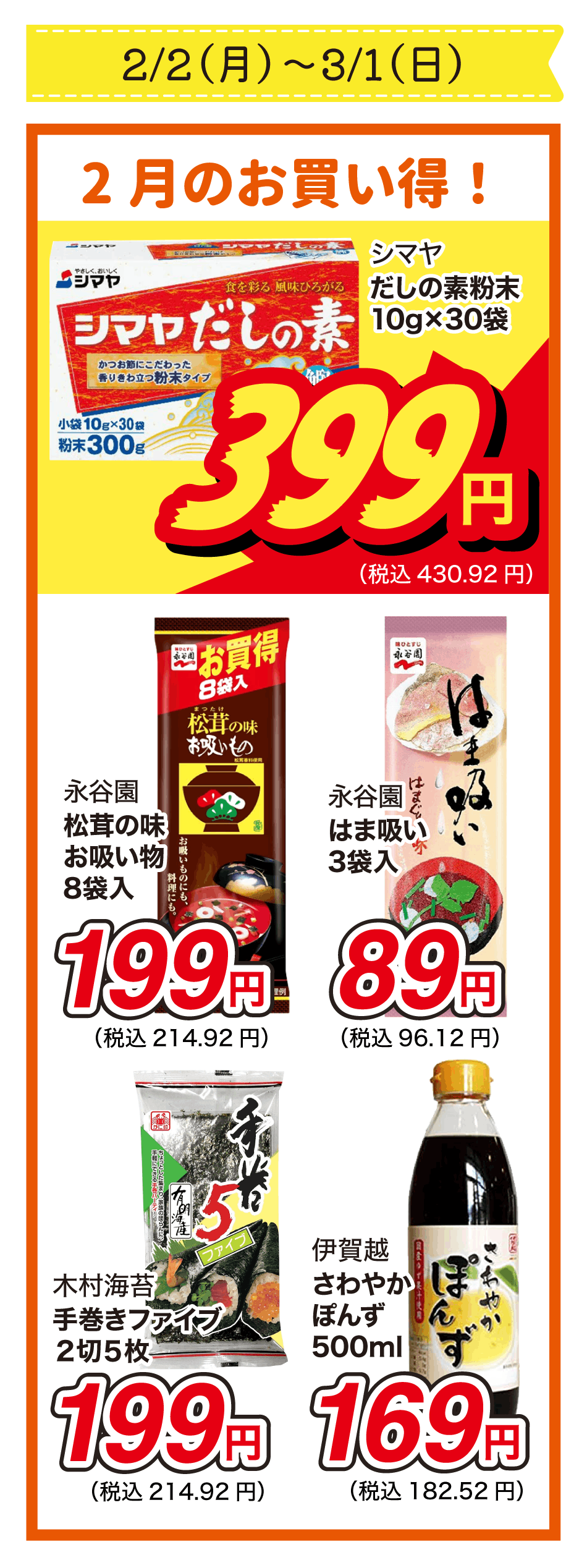 【九州版】2月のお買い得商品のご紹介(1/26〜2/22) 2026年2月2日 最終更新日時 : 2026年2月2日 dxmanso毎日の『安い!』をお届けします!ふだんの食事に嬉しい食材を各種お安く取り揃えています!今月のお買い物もお近くのアルゾへ!