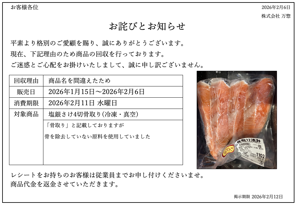 以下の店舗にて販売した商品について、お詫びとお知らせがございます。